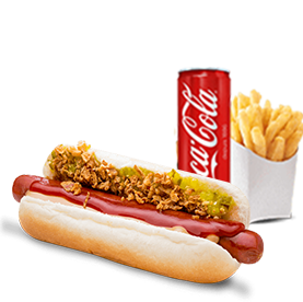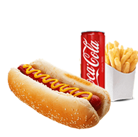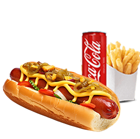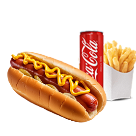 Pain hot dog, saucisse de volaille, ketchup, moutarde yellow + Frites + 1 Boisson 33cl au choix.