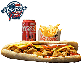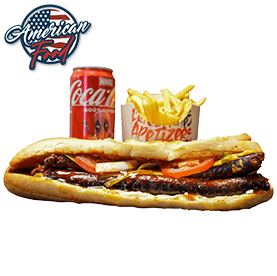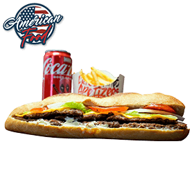 Pain baguette, salade, tomates, oignons rouges, sauce au choix + Frites + 1 Boisson 33cl au choix.