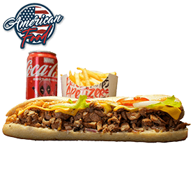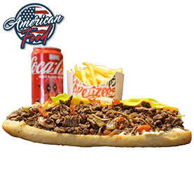 Pain baguette, noix de veau, cheddar, poivrons, jalapenos, salade, tomates, oignons rouges, sauce au choix + Frites + 1 Boisson 33cl au choix.