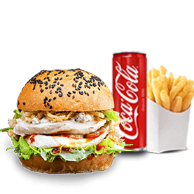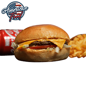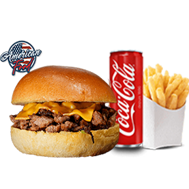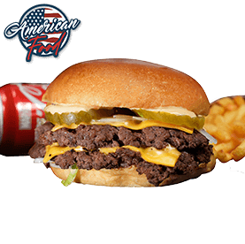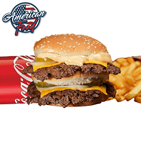 Double escalope, cheddar, salade, tomates, oignons rouges + Frites + 1 Boisson 33cl au choix.